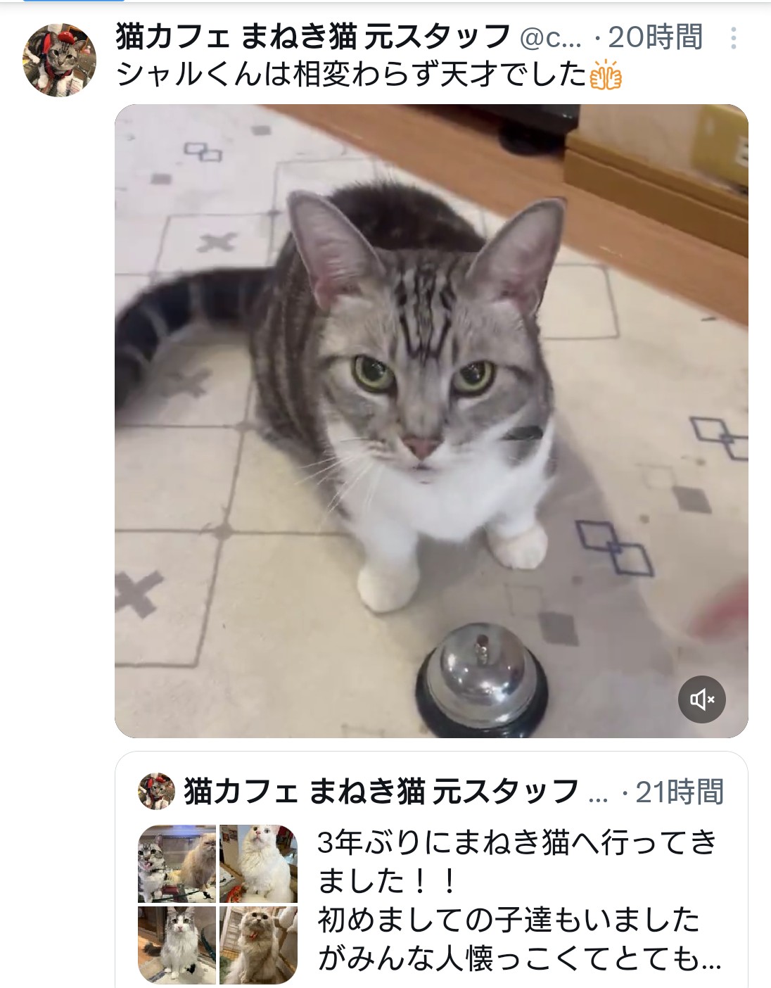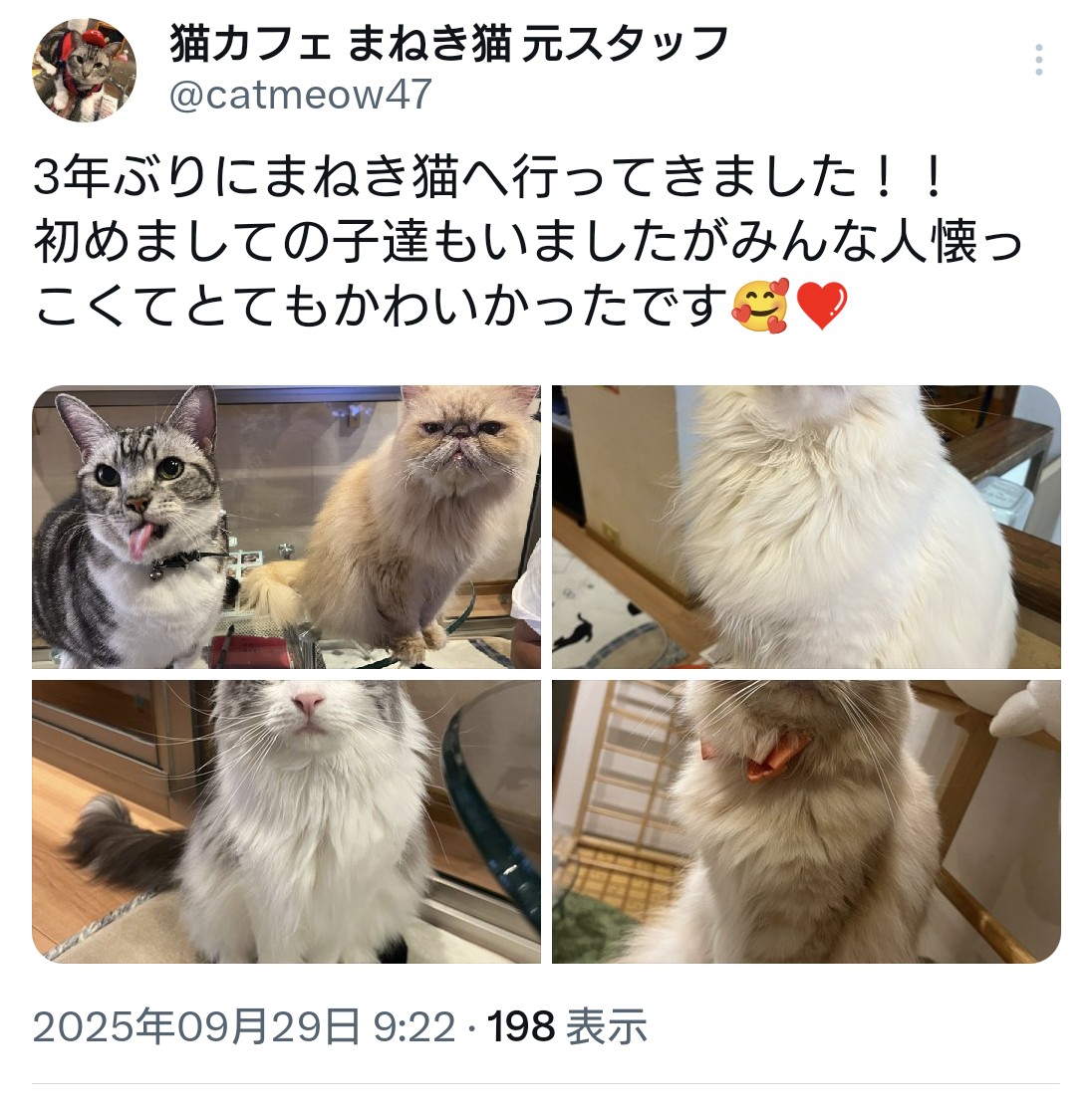 久しぶりに♫ 2025/09/30 // No Comments 先週はまねき猫元スタッフさん3年ぶりに遊びに来てくれました。 可愛がってもらっていた子達の反応がすごい!! 声を覚えているのかシャルルくん9歳教えてもらった得意芸 お手やお変わり呼び鈴を鳴らしちょうだいちょうだいポーズ♫ 猫ちゃん達おやつのプレゼントを頂きました。 沢山ありがとうございます♡ また元気なお顔を見せに来てくださいね 猫ちゃん達も楽しみに待っています♫